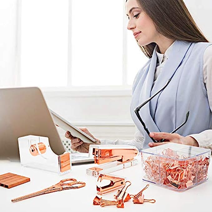 • 【Package includes】:1xStapler,1xTape Dispenser,1xStaple Remover,1xScissors,26pcs Binder Clips,100pcs Paper Clips,100pcs Push Pins and 1000pcs staples(all Rosegold)
